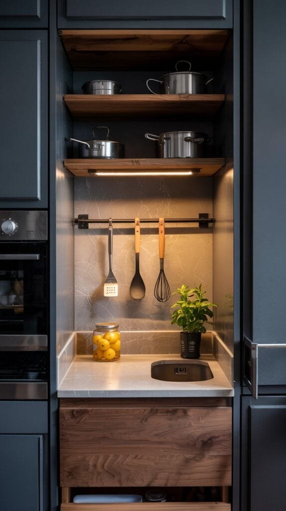 Layer charcoal linen or rattan drawer dividers to corral cutlery and utensils, so every pull feels intentional. Tiny kitchens don’t need to feel tiny—they just need a little choreography.