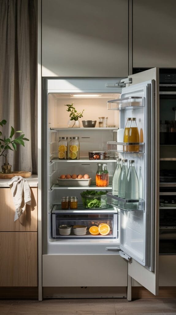 Even a small fridge can look sorted—clear bins for cheeses, dressings, and fruits bring order and make you reach for ingredients faster.