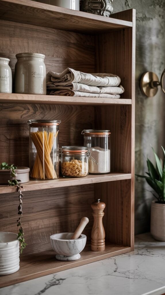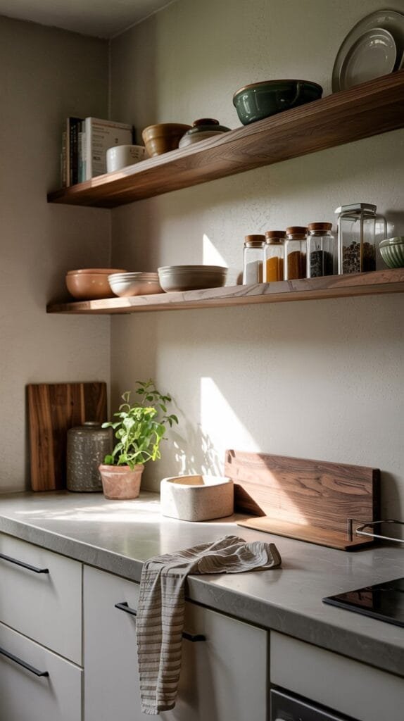 Forget cluttered countertops. Floating shelves in walnut or ash create breathing space while holding curated ceramics and spice jars that look like art.