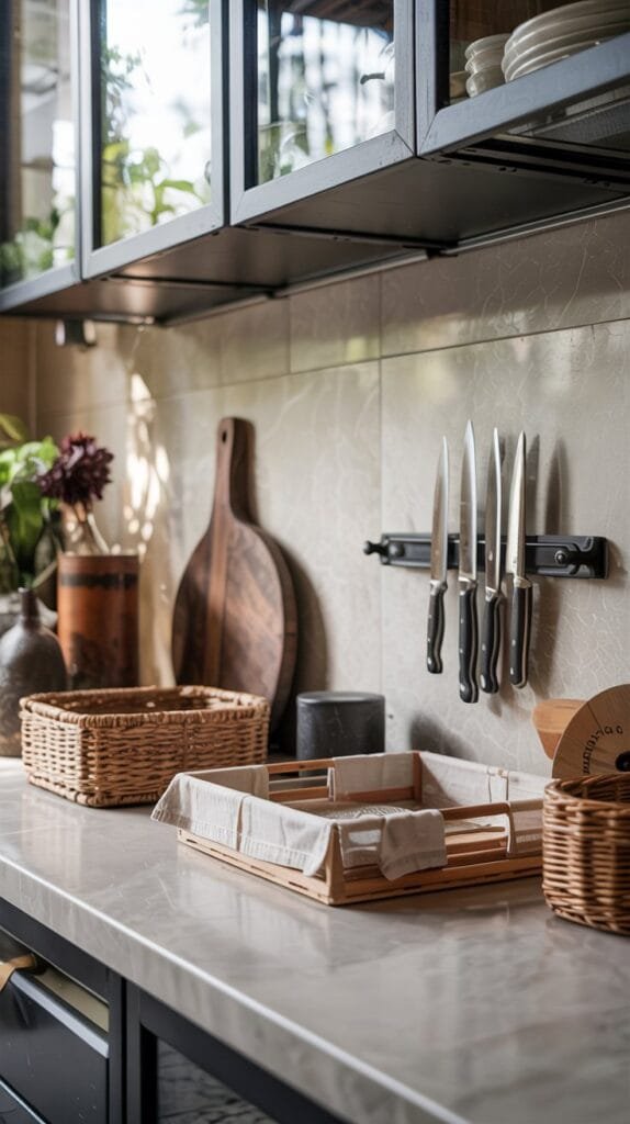 Layering woven baskets and linen-lined trays keeps utensils within reach but visually tidy.