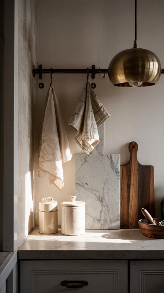 Hanging linen dish towels or minimalist aprons adds texture without clutter. Even under-cabinet lighting or a sculptural pendant transforms a functional zone into a moment of calm beauty.