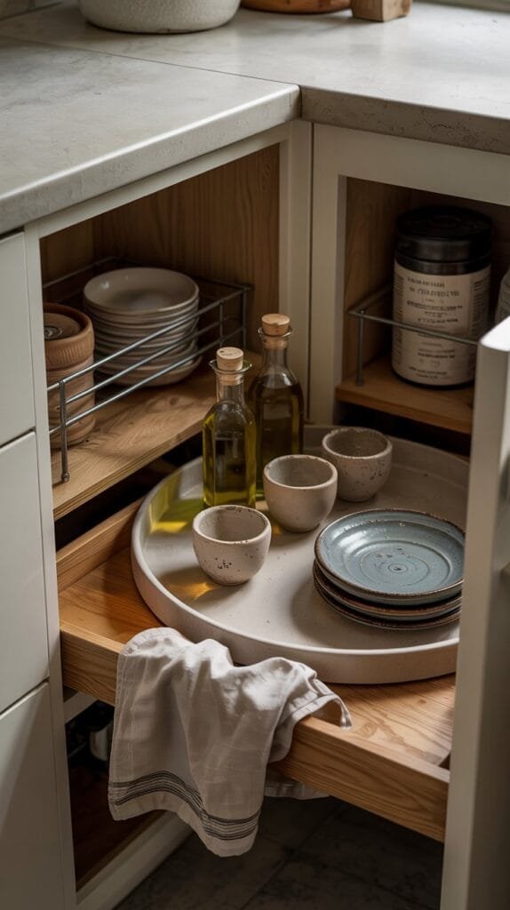 Corners can be dramatic. Lazy Susans in lower cabinets or tiered pull-outs transform wasted space into a functional stage for oils, vinegars, or small appliances. Door-mounted racks keep snacks and wraps at eye level while leaving drawer fronts pristine.