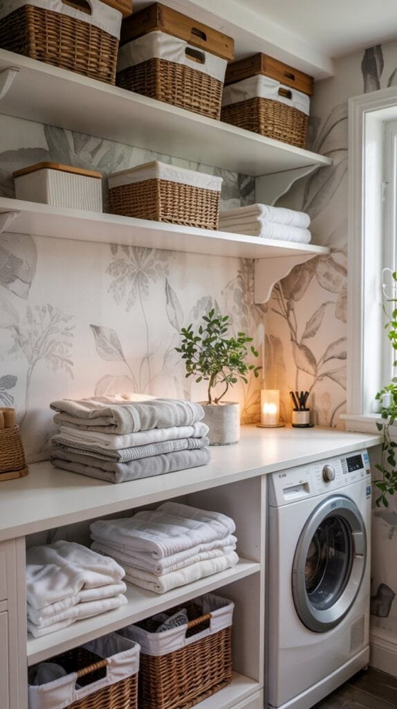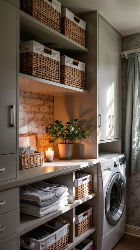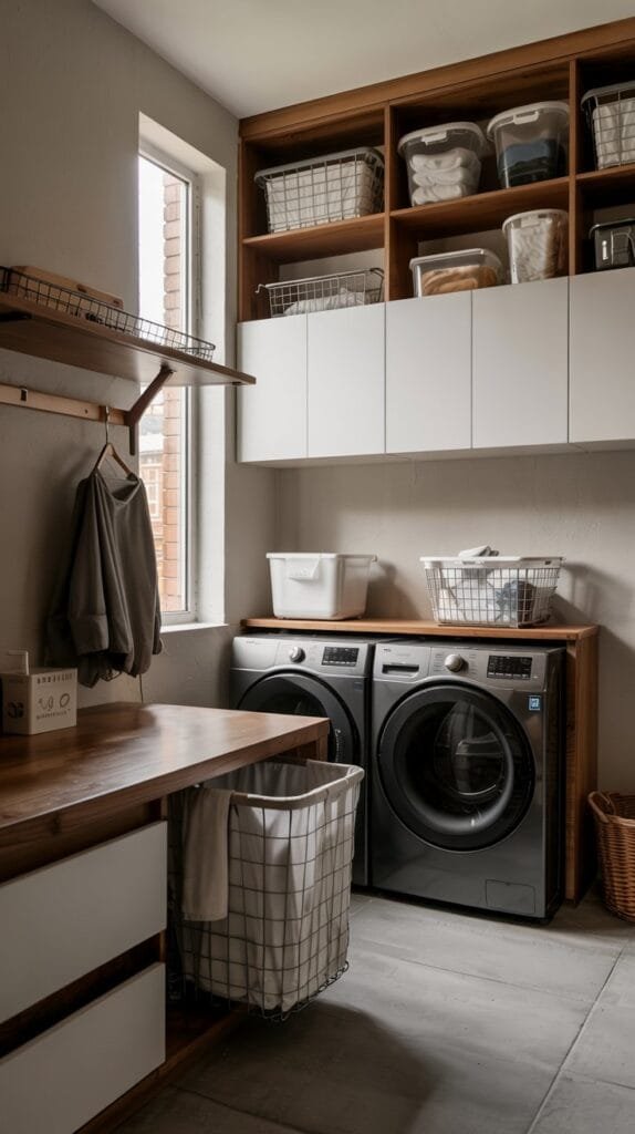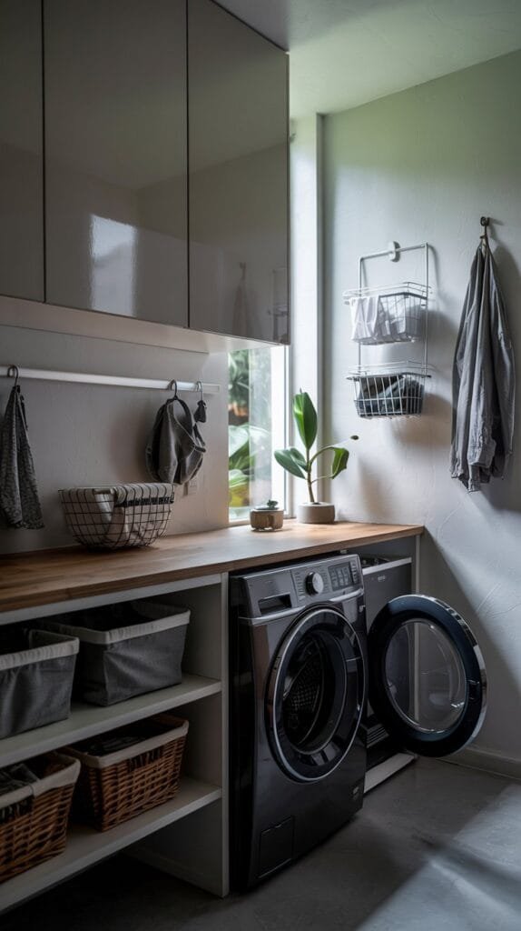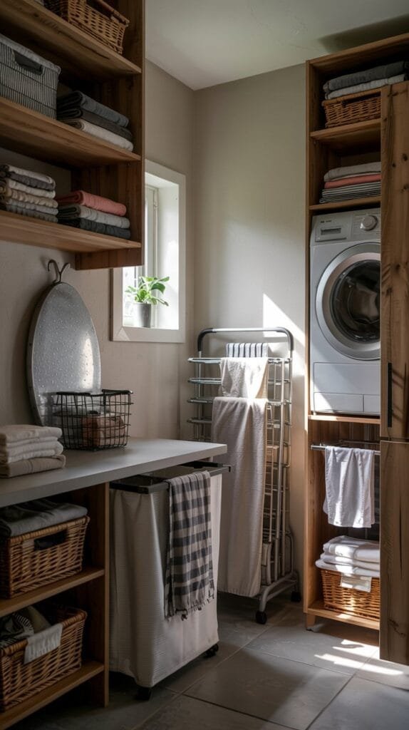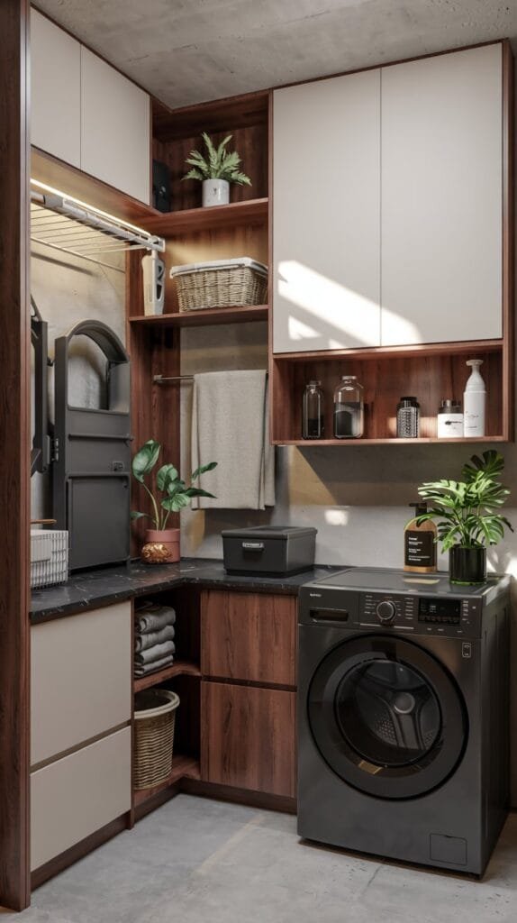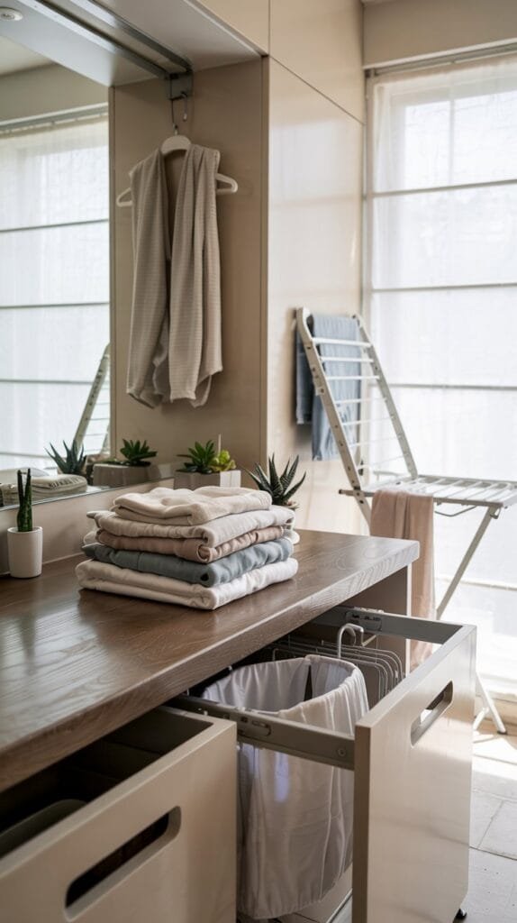 Small rooms thrive on flexible systems. Pull-out hampers, fold-down ironing boards, or collapsible drying racks keep the space uncluttered when not in use.