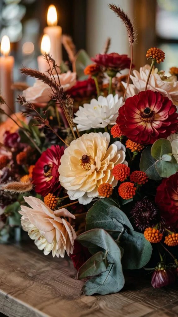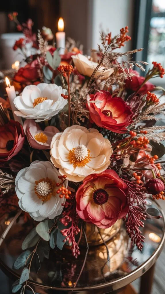 Think of holiday flower arrangements as more than filler—they’re the first thing guests notice. Imagine a low, sprawling centerpiece with burnt-orange dahlias, deep burgundy chrysanthemums, and soft peach roses, their petals catching the golden afternoon light.