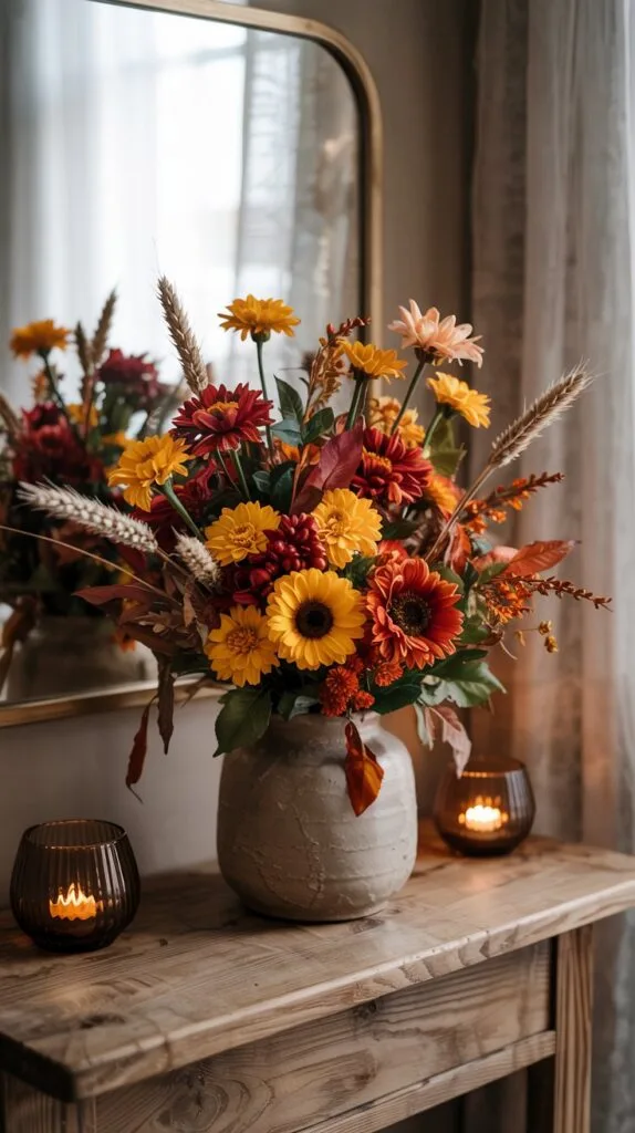 A cluster of mini pumpkins, berry sprigs, and dried flowers in a simple glass vase instantly ups the ante. Or go bold with oversized roses, hyper-saturated leaves, and trailing vines for drama that doesn’t feel overdone.