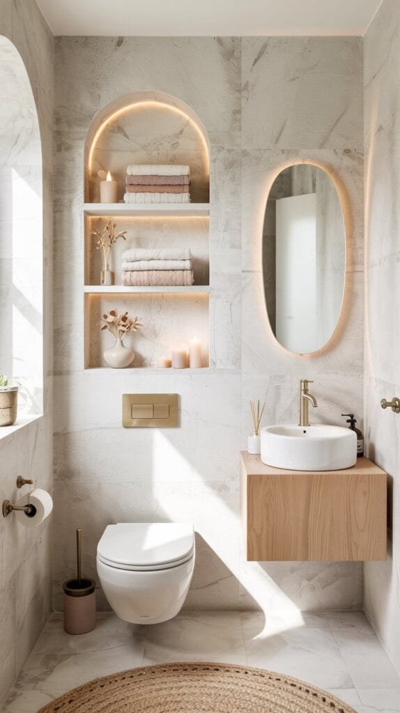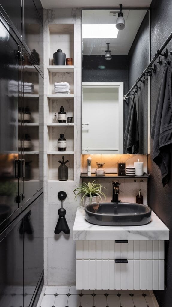 Storage in tiny bathrooms isn’t just practical—it can be beautifully integrated.