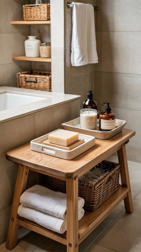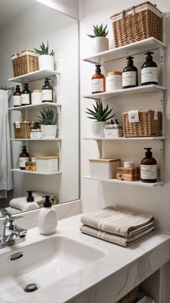 ✨ Amazon Pick: Look for slimline wall-mounted shelves or floating storage ledges. Style with mini vases, folded towels, or ceramic trays to keep it minimal and clean.