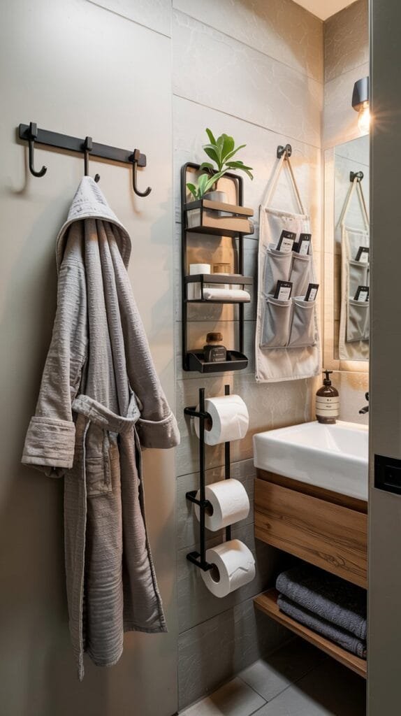 For those leaning toward small bathroom storage DIYs, a simple wooden peg rail and a row of soft fabric baskets can transform a blank wall into an organized moment you actually want to photograph.