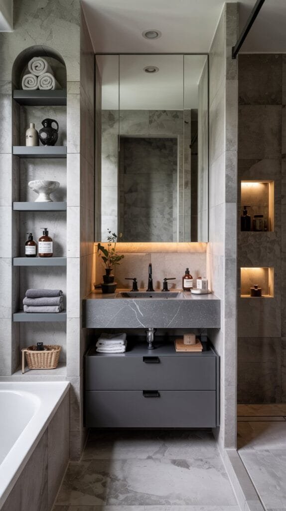 Pro tip: Go vertical. Use tall mirror cabinets or full-height shelving units that don’t eat up floor space. And match them to your walls—this trick makes them feel less bulky and more architectural.