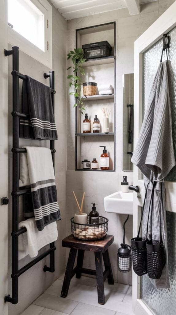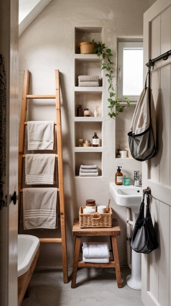 Instead of a bulky cabinet, try stacked towel ladders against the wall or narrow built-ins between studs. Even a vintage stool can hold a basket of products without adding visual clutter.